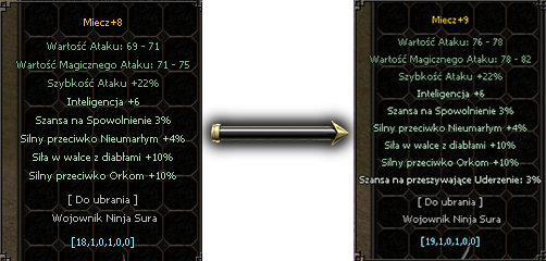 Każdy przedmiot, po pomyślnym ulepszeniu na +9 zostanie wyposażony w DODATKOWY specjalny bonus, który wzmocni Wasze postaci. Wartość jaka może być wylosowana jest "przed ostatnią" wartością jaką możemy uzyskać.
